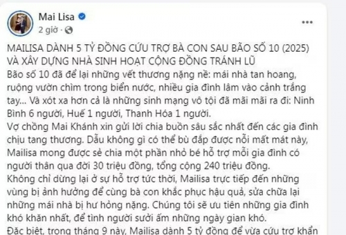 Với tinh thần sẻ chia, trên trang cá nhân, doanh nhân Phan Thị Mai (hiện đang sinh sống tại TP HCM) vừa có bài đăng gây chú ý. Theo đó, nữ đại gia quyết định chi 5 tỷ để hỗ trợ cho bà con sau cơn bão số 10 và xây nhà sinh hoạt cộng đồng để tránh lũ. Ảnh chụp màn hình |