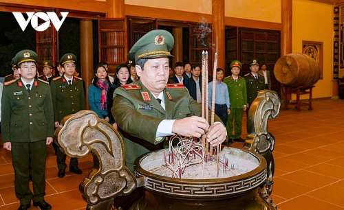 Thiếu tướng Nguyễn Hồng Nguyên, Phó Chánh Văn phòng Bộ Công an, Phó Trưởng Ban thường trực Ban Chỉ huy phòng thủ dân sự Bộ Công an dâng hoa, dâng hương tưởng nhớ công lao to lớn của các anh hùng, liệt sỹ. (Ảnh: Bá Thăng) |