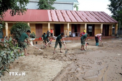 Cán bộ chiến sỹ Tiểu đoàn 6, Trung đoàn 12, Sư đoàn 3, Quân khu 1 giúp Trường Trung học cơ sở xã Yên Bình, tỉnh Lạng Sơn thu dọn vệ sinh trường lớp học. (Ảnh: Văn Đạt/TTXVN) |