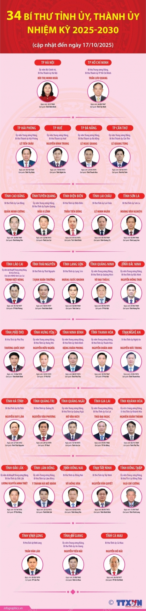 Danh sách 34 Bí thư Tỉnh ủy, Thành ủy nhiệm kỳ 2025-2030. Đồ họa TTXVN |