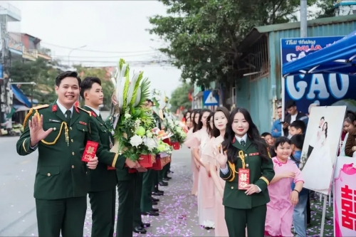 Ngày 17/1, đám hỏi của cô dâu Phương Anh (quê Hưng Yên) và chú rể Đình Văn (quê Phú Thọ) diễn ra trong không khí ấm cúng tại quê nhà cô dâu. Bên cạnh niềm vui của hai nhân vật chính, buổi lễ còn thu hút sự chú ý đặc biệt từ cộng đồng mạng nhờ hình ảnh dàn bê tráp diện quân phục chỉnh tề, có ngoại hình sáng và đồng đều.