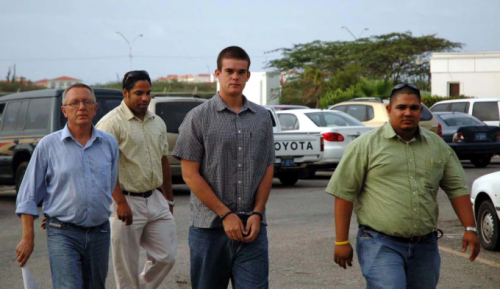 Joran van der Sloot bị còng tay đưa đi xét nghiệm ADN vào ngày 20/7/2005, ở Aruba. Ảnh: AP |