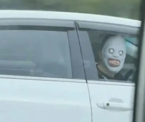 Sự việc xảy ra vào ngày 24/8. Theo đoạn video được hành khách trên một chiếc xe chạy cùng chiều ghi lại, người đàn ông ngồi trong xe phía trước bất ngờ hạ cửa kính, quay sang nhìn sang chiếc xe bên cạnh với chiếc mặt nạ đáng sợ che kín gương mặt.