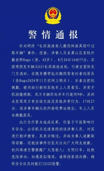Một giáo viên nước ngoài đang giảng dạy tại Trung Quốc đã chính thức lên tiếng xin lỗi sau khi gây xôn xao mạng xã hội vì hành động đeo mặt nạ kinh dị khi ngồi trong xe ô tô trên đường cao tốc đông đúc gần thành phố Hàng Châu, tỉnh Chiết Giang.