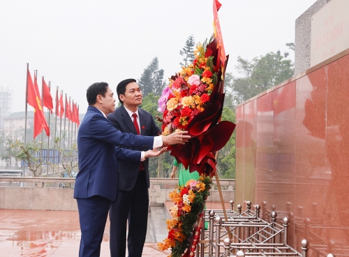 Các đồng chí: Hoàng Nghĩa Hiếu - Phó Bí thư Thường trực Tỉnh uỷ, Chủ tịch HĐND tỉnh; Võ Trọng Hải – Phó Bí thư Tỉnh ủy, Chủ tịch UBND tỉnh dâng hoa lên Tượng đài Bác Hồ |