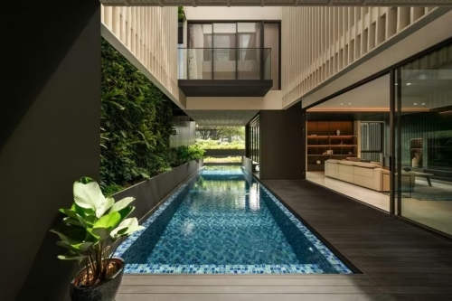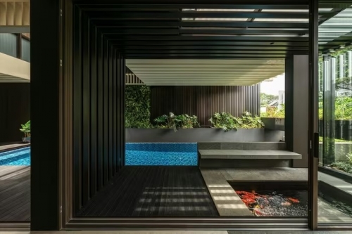 Hồ bơi đặt giữa trung tâm tầng 2. Bể cá koi đặt tại tiền sảnh tạo khoảng đệm trước khi vào khu sinh hoạt. Ảnh: Arte Haus |