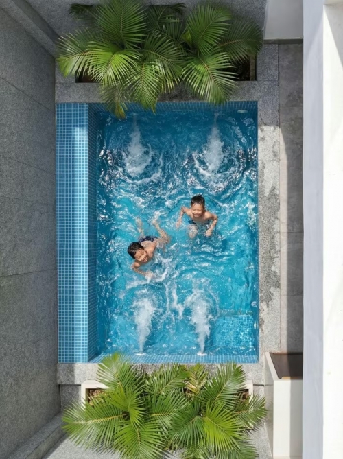 Bể bơi tại tầng trệt góp phần thông thoáng cho ngôi nhà. Ảnh: Lê Quang Bình |