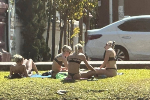 Du khách nước ngoài mặc bikini ngồi và nằm trên bãi cỏ trước ngôi chùa ở Chiang Mai. Ảnh: Khaosod. |