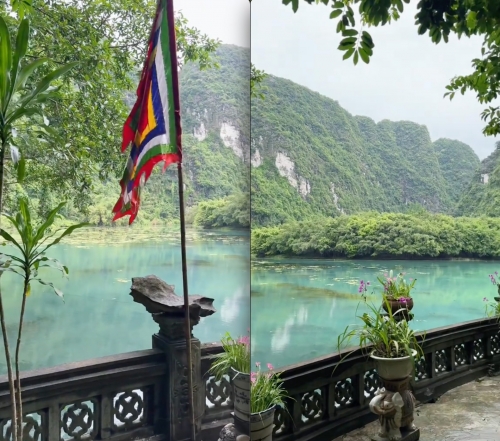 Trong đoạn video được cô chia sẻ, Tràng An hiện ra với mặt nước xanh ngọc bích lấp lánh như pha lê, trong veo tới mức có thể soi rõ từng mảng rong rêu dưới đáy. Ánh sáng buổi chiều phản chiếu trên làn nước khiến khung cảnh thêm phần huyền ảo - những dãy núi đá vôi như nổi bật hơn, mềm mại hơn giữa nền trời trong xanh và dòng nước mướt mát như một dải lụa ngọc.