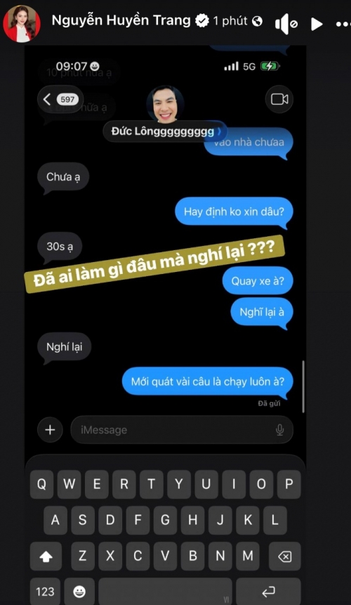 Trên story cá nhân, nữ MC chia sẻ ảnh chụp màn hình cuộc trò chuyện giữa hai người. Khi cô hỏi chồng 'vào nhà chưa?', Đức Huy trả lời rằng mình 'chưa' và nói cần thêm '30 giây nữa'.