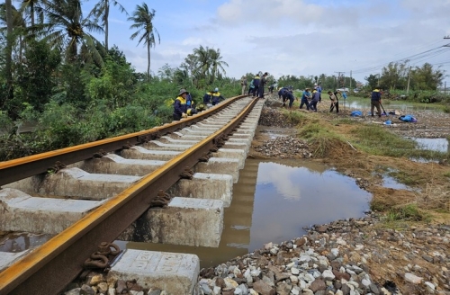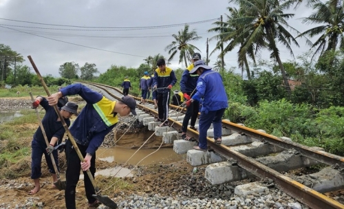 Còn tuyến đường sắt Diêu Trì - Quy Nhơn bị nước lũ cuốn trôi nền đá sâu trung bình 28cm, trôi nền đường sâu trung bình 40cm tại km2+800 đến km4+200. Đoạn đường sắt này đã phong tỏa từ ngày 21-11 để khắc phục.