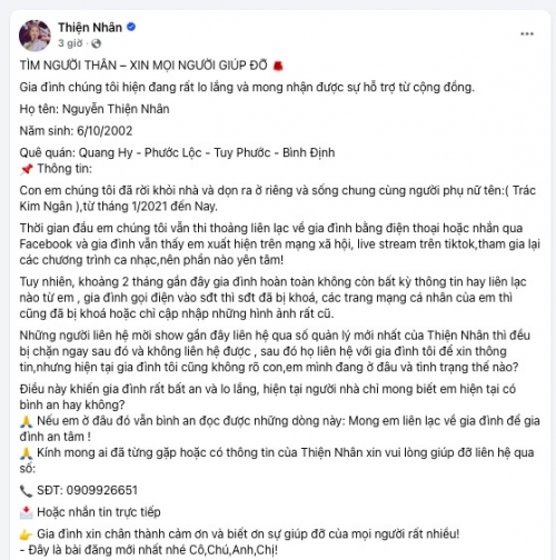 Mới đây, gia đình ca sĩ Nguyễn Thiện Nhân khiến dư luận chú ý khi đăng tải thông báo tìm kiếm trên fanpage có gần 700.000 lượt theo dõi, cho biết đã mất liên lạc với nữ ca sĩ trong thời gian dài.