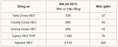 Tất cả các sản phẩm HEV của Toyota đều đủ điều kiện hưởng ưu đãi thuế TTĐB. Liên doanh Nhật giảm giá hàng chục đến hàng trăm triệu đồng cho các bản hybrid của Camry, Yaris Cross, Corolla Cross, Innova Cross, Alphard.