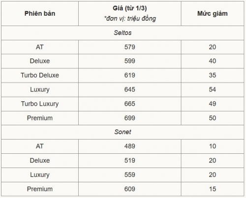 Để gia tăng sức cạnh tranh trong phân khúc CUV cỡ B chạy xăng trước sự vươn lên của hai đối thủ Nhật là Toyota Yaris Cross, Mitsubishi Xforce, đơn vị phân phối của Kia là Trường Hải điều chỉnh giá bán lẻ của tất cả các phiên bản Seltos. Bên cạnh đó, mẫu Sonet ở nhóm CUV cỡ A+ cũng giảm giá.