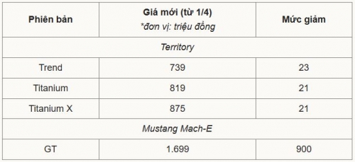 Liên doanh Mỹ giảm giá bán lẻ hai mẫu Territory và Mustang Mach-E từ đầu tháng 4. Mức giảm 900 triệu đồng của mẫu xe thuần điện Mustang Mach-E thuộc hàng cao nhất thị trường.