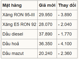 Theo điều chỉnh của Liên bộ Công Thương - Tài chính, giá xăng RON 95-III (loại phổ biến trên thị trường) giảm 3.890 đồng, xuống 29.950 đồng một lít. Tương tự, E5 RON 92 hạ 2.040 đồng, có giá mới 28.070 đồng.
