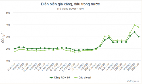 Trước đó, lúc 23h ngày 24/3, giá xăng dầu được điều chỉnh tăng 2.940-6.240 đồng một lít, tùy mặt hàng. Trong đó, RON 95-III lên 33.840 đồng, dầu diesel 39.660 đồng một lít.