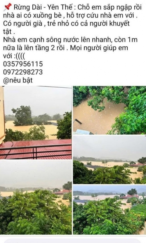 Theo đó, vào chiều 7/10, tại thôn Rừng Dài, xã Tam Tiến (tỉnh Bắc Ninh), mưa lớn kéo dài khiến nước lũ dâng cao, nhiều hộ dân bị cô lập hoàn toàn, các khu dân cư bị chia cắt giữa mênh mông biển nước. Khoảng 14h cùng ngày, các lực lượng chức năng tiếp nhận thông tin kêu cứu trên Facebook có 14 người mắc kẹt trong nhà do nước sông lên nhanh và ngập sâu.
