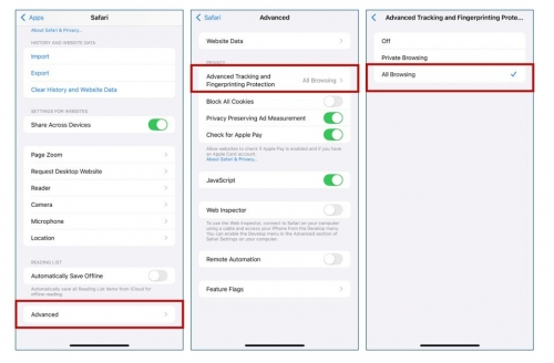 Trong cài đặt Safari trên iPhone, ở mục "Nâng cao", bạn sẽ thấy tùy chọn có tên "Bảo vệ theo dõi và dấu vân tay nâng cao". Theo mặc định, tùy chọn này hiện đang được chuyển thành "Duyệt riêng tư", nhưng sẽ mặc định là "Duyệt toàn bộ" trong iOS 26.