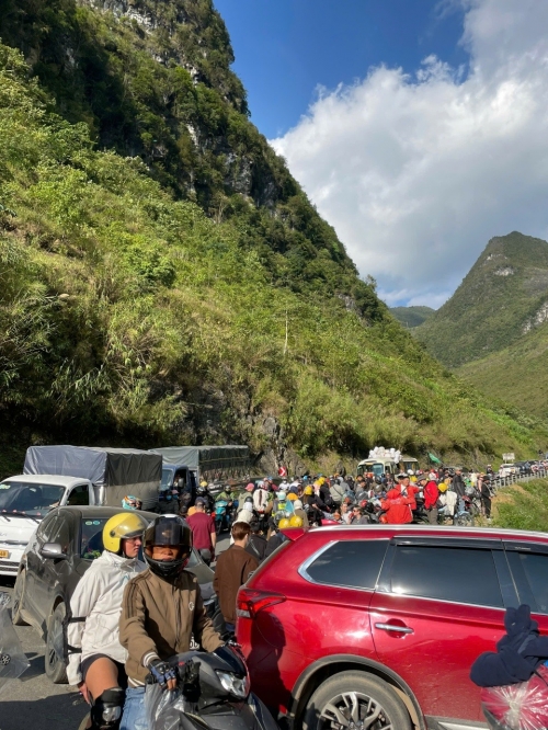 Tí Lầu, 29 tuổi, người làm du lịch Hà Giang gần 9 năm, đăng tải bức ảnh dòng phương tiện nối đuôi nhau tắc cứng.