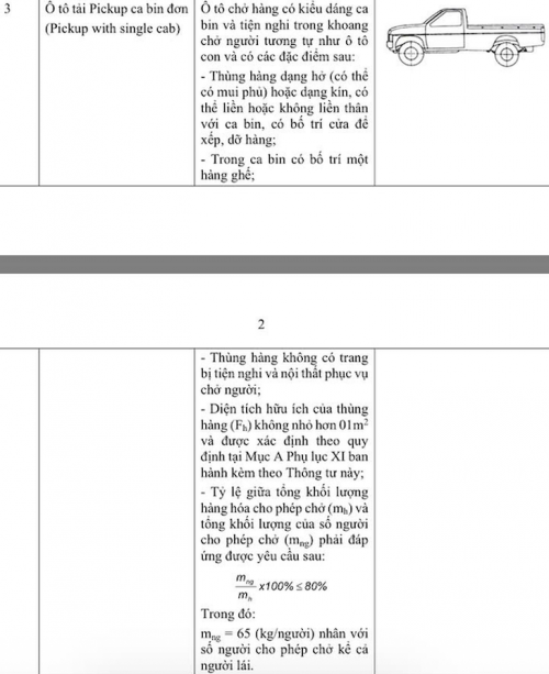 Thứ hai là ô tô tải pickup, thuộc nhóm ô tô tải thông dụng, quy định tại mục 3 và 4, phụ lục IV của cùng Thông tư. Loại này bao gồm cabin đơn hoặc cabin kép.