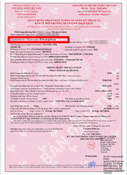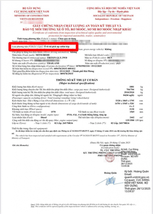 Cụ thể, cần đối chiếu mục "loại phương tiện" và "khối lượng toàn bộ" được ghi trên giấy tờ này để xác định xe của mình là ô tô con pickup hay ô tô tải pickup.