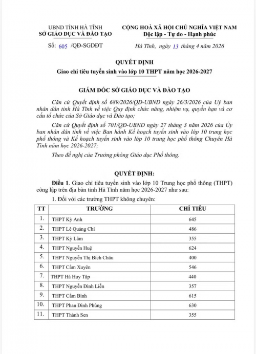 Theo đó, năm học 2026-2027, Hà Tĩnh dự kiến tuyển sinh 16.292 chỉ tiêu vào lớp 10 đối với các trường THPT công lập, tăng 2.874 học sinh so với năm học 2025–2026 (13.418 chỉ tiêu).