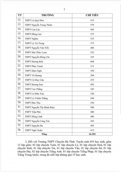 Một số trường có mức tăng cao so với năm trước như: THPT Cẩm Xuyên (từ 405 lên 615 học sinh), THPT Nguyễn Trung Thiên (từ 405 lên 579 học sinh), THPT Phan Đình Phùng (từ 495 lên 630 học sinh), THPT Hà Huy Tập (từ 450 lên 546 học sinh). Nhiều trường khác cũng được điều chỉnh tăng như THPT Hồng Lĩnh (390 lên 480 học sinh), THPT Trần Phú (410 lên 480 học sinh), THPT Nghèn (450 lên 535 học sinh).
