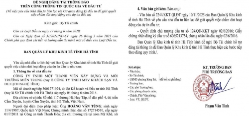 Tuy nhiên, sau nhiều năm, dự án không đạt tiến độ như cam kết. Căn cứ Văn bản số 2244/KKT-QLĐT ngày 10/11/2025, Ban Quản lý Khu kinh tế tỉnh Hà Tĩnh yêu cầu doanh nghiệp liên hệ để giải quyết việc chấm dứt hoạt động dự án.