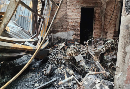 Nhiều xe máy bị thiêu rụi trong vụ cháy. Ảnh: Huy Thanh |