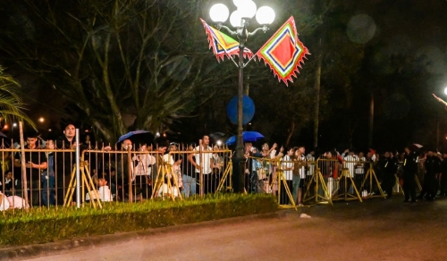 Mặc dù không khí lạnh tràn về, trời mưa khá to, tuy nhiên hàng ngàn người dân vẫn "đội mưa" xuyên đêm chờ đến giờ phát ấn để xin lộc cầu may mắn, bình an.