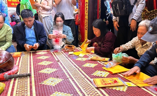 Nhiều người dân, du khách "đội mưa" trên tay cầm những cánh ấn cầu khấn trước các nhà đền cầu may mắn, sức khỏe, bình an |