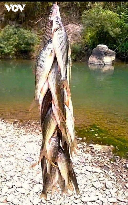 9h sáng nay (12/2) anh Vi Văn Giao (42 tuổi) cùng con trai 16 tuổi, trú ở bản Hạt, xã Yên Na mang theo chài, vợt, tới suối Chà Hạ chảy qua địa bàn bản dài hơn 2 km để bắt cá trong ngày hội của bản.