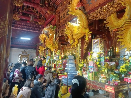 Người dân mang theo đồ lễ, hoa vào đền thắp hương |