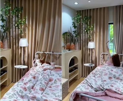 Phòng ngủ dịu nhẹ với tông màu pastel, cây xanh điểm xuyết tạo điểm nhấn. Ảnh: chụp màn hình |