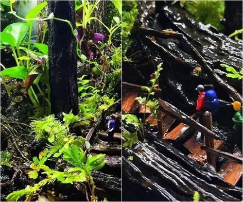 Elly Trần tỉ mỉ gắn mô hình người leo núi, đèn sáng, suối nước trong nhà tí hon. Ảnh chụp màn hình |