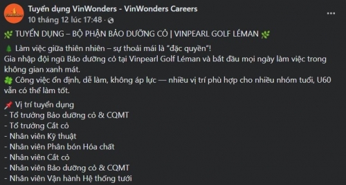 Các quyền lợi nội bộ khác như vui chơi miễn phí tại VinWonders hay Vinpearl Safari cũng được áp dụng cho khối nhân sự này. Động thái tuyển dụng với dải lương và phúc lợi rõ ràng này cho thấy chiến lược thu hút nhân sự bài bản của các doanh nghiệp vận hành sân golf chuyên nghiệp, trong bối cảnh thị trường lao động phổ thông đang đòi hỏi mức đãi ngộ ngày càng cao để đảm bảo tính ổn định của bộ máy vận hành.