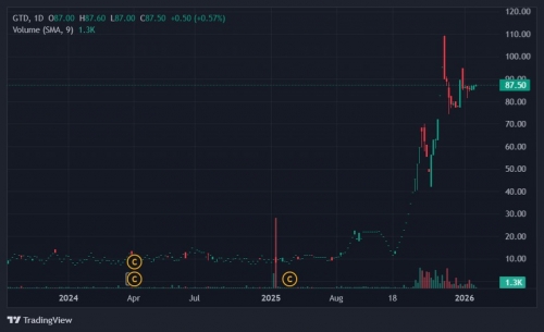 Cổ phiếu GTD tăng mạnh khi UBND TP Hà Nội lên kế hoạch đấu giá hơn 6,38 triệu cổ phiếu. Ảnh: TradingView. |