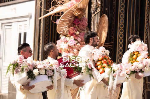 Khoảng hơn 9h, chú rể Justin Cohan cùng gia đình và đội hình bê tráp nhà trai có mặt đầy đủ. Tất cả đều diện áo dài trắng tinh giản nhưng tinh tế, tạo nên tổng thể đồng điệu và trang trọng.