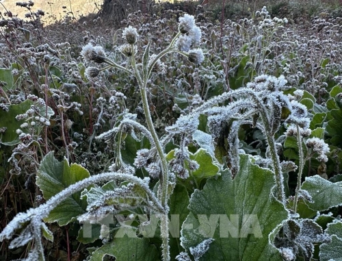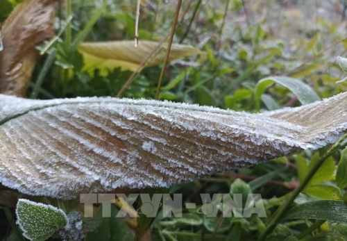 Sương muối tạo thành lớp băng mỏng trên cây cỏ. Ảnh: Đức Thọ - TTXVN |