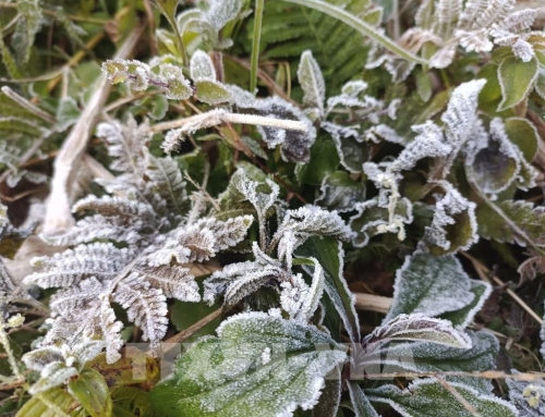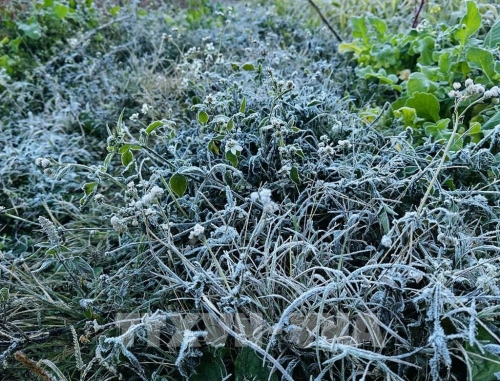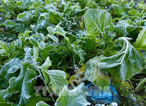 Sương muối tạo thành lớp băng mỏng trên cây cối, rau màu. Ảnh: Đức Thọ - TTXVN |