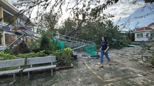 Cô Trương Thị Tâm ở Trường THCS - THPT Võ Nguyên Giáp (xã Xuân Cảnh, tỉnh Đắk Lắk) dọn dẹp cây cối ngã đổ sáng 7-11 - Ảnh: TRUNG TÂN |