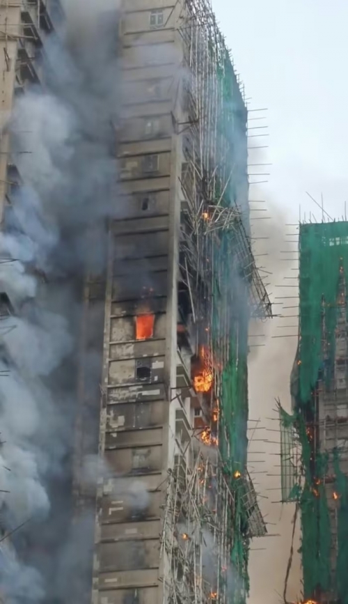 Ngọn lửa bùng phát tại phần giàn giáo tre — vốn đang dùng để cải tạo bên ngoài tòa nhà — và nhanh chóng lan sang ít nhất năm tòa nhà cao tầng liền kề.