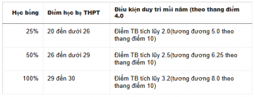 Theo đó, trường xét cấp học bổng toàn phần (miễn học phí toàn khóa) cho thí sinh đoạt giải nhất cấp quốc gia; huy chương vàng, bạc, đồng cấp quốc tế tại các kỳ thi Olympic quốc tế, kỳ thi học sinh giỏi quốc gia các môn Toán, Vật lý, Hóa học, Sinh học, Tin học; cuộc thi Khoa học kỹ thuật. Học bổng này cũng dành cho thí sinh có điểm trúng tuyển cao nhất trong kỳ xét tuyển.