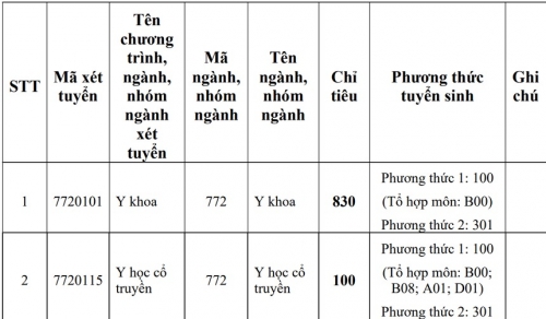 Trường tuyển 2.155 chỉ tiêu cho năm học 2026-2027, tăng 235 chỉ tiêu so với năm trước. Ngành mở mới là Kỹ thuật gây mê hồi sức với 50 chỉ tiêu. Ngành Y khoa cũng bổ sung chương trình tăng cường tiếng Anh còn ngành Điều dưỡng có thêm chuyên ngành Cấp cứu ngoài bệnh viện.