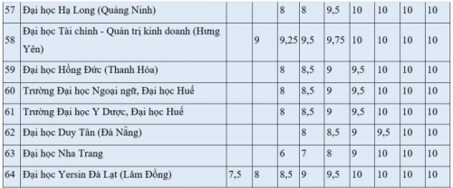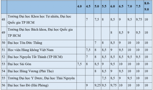 Số còn lại hầu hết yêu cầu IELTS từ 5.0. Nếu có IELTS từ 7.0 trở lên, nhiều trường tính cho thí sinh thành 10 điểm Tiếng Anh, như Đại học Bách khoa Hà Nội, Công nghiệp Hà Nội, Thương mại...