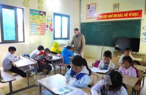 Giáo viên cắm bản tại Điểm trường Phổ thông dân tộc bán trú Tiểu học Nhôn Mai đứng lớp ghép. Ảnh: Xuân Tiến - TTXVN |