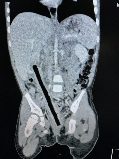 Theo BSCK1 Nguyễn Hiền, Khoa Ngoại tổng hợp - Bệnh viện Nhi Đồng 2, kết quả CT scan cho thấy trong ổ bụng bệnh nhi có dị vật kích thước 1x16 cm nằm vùng từ trực tràng đến gan.