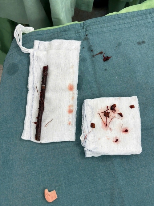Sau 4 giờ phẫu thuật, các bác sĩ đã lấy ra nguyên vẹn nhành cây dài 16 cm. Bệnh nhi được xử lý cầm máu, khâu các vết thương và làm hậu môn tạm. Hiện bé đang dần hồi phục và dự kiến sẽ xuất viện sau 1 tuần.