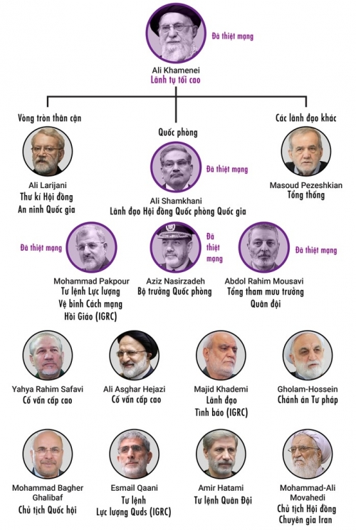 Trước đó, theo The Hindu, bộ máy lãnh đạo của Iran cũng thiệt hại nặng trong cuộc tấn công vào ngày 13-6 năm ngoái, gồm: 1. Tư lệnh Lực lượng Vệ binh cách mạng Hồi giáo Iran (IRGC) Hossein Salami. 2. Tổng tham mưu trưởng Lực lượng Vũ trang Iran Mohammed Bagheri 3. Cựu Tổng tham mưu trưởng Lực lượng Vũ trang Iran Mahmoud Bagheri 4. Lãnh đạo Trụ sở Bộ Chỉ huy Trung ương Khatam Al-Anbia Gholamali Rashi 5. Tư lệnh Lực lượng Không gian vũ trụ IRGC Amir Ali Hajizade 6. Phó Tư lệnh Lực lượng Không gian vũ trụ IRGC Khosro Hasani 7. Chỉ huy cấp cao của Lực lượng Không gian vũ trụ IRGC Davoud Sheikhian 8. Phát ngôn viên của Lực lượng Không gian vũ trụ IRGC Masoud Tayyeb 9. Phó cục trưởng Cục Tác chiến của Bộ Tổng tham mưu Lực lượng Vũ trang Iran Mehdi Rabbani. 10. Chỉ huy cấp cao trong IRGC Mohammad Bagher Taherpour 11. Tư lệnh Tổ chức tình báo IRGC Mohammad Kazemi 12. Phó Tư lệnh Tổ chức Tình báo IRGC: Hassan Mohaghegh 13. Trưởng bộ phận Tình báo của Lực lượng Quds Mohsen Bagheri 14. Cựu lãnh đạo Nhóm Shahid Karimi: Akbar Motalebizadeh Bên cạnh đó, một số nhà khoa học hàng đầu của Iran đã thiệt mạng không cuộc tấn công này. |